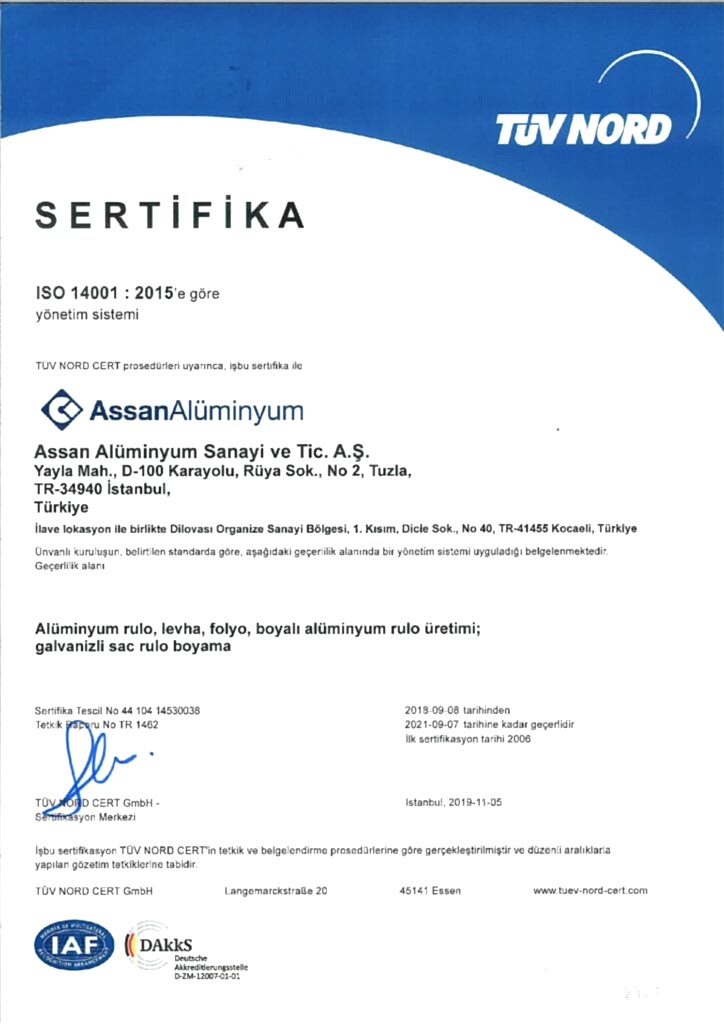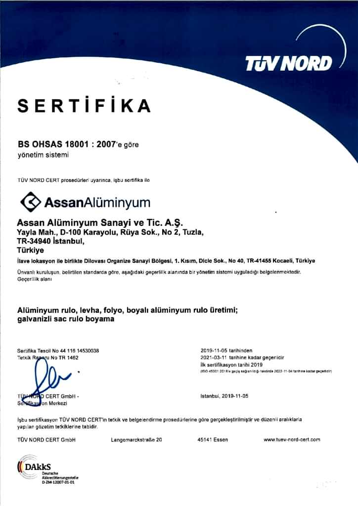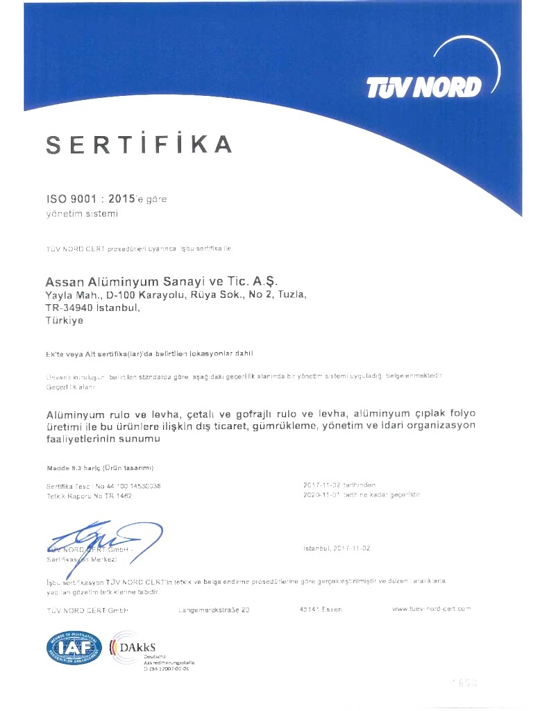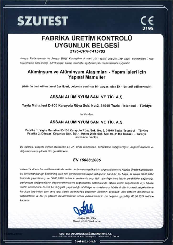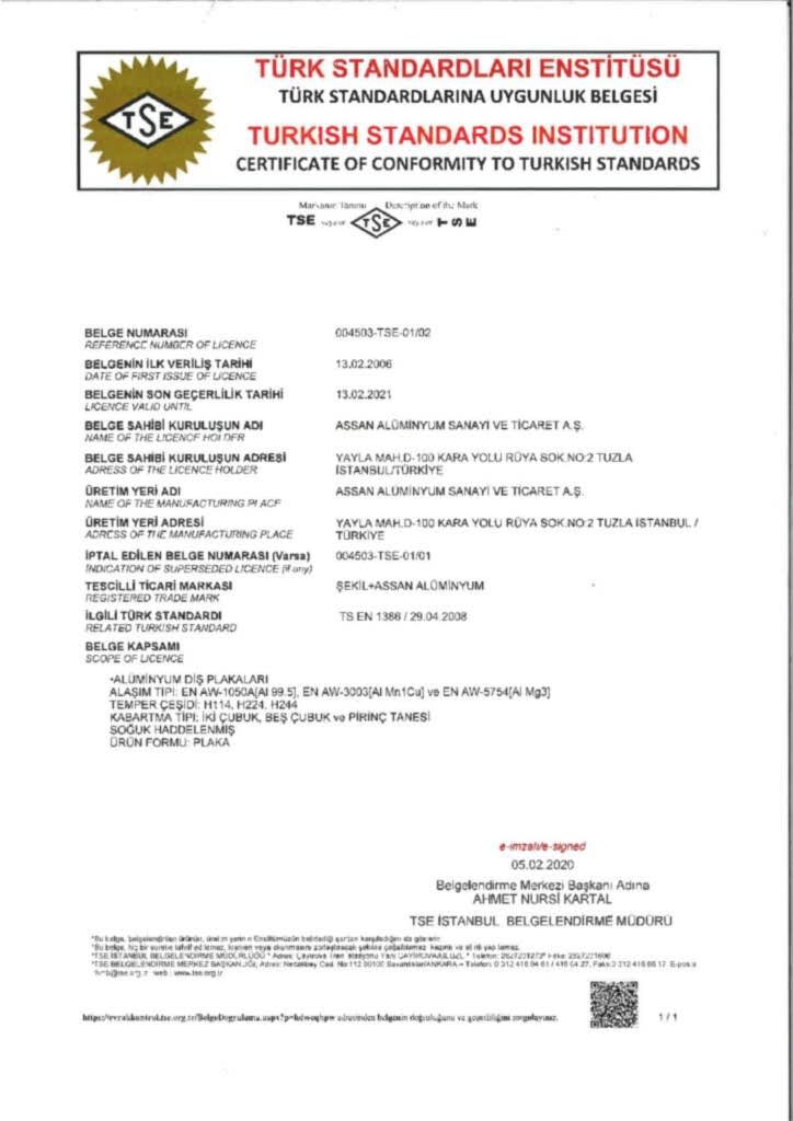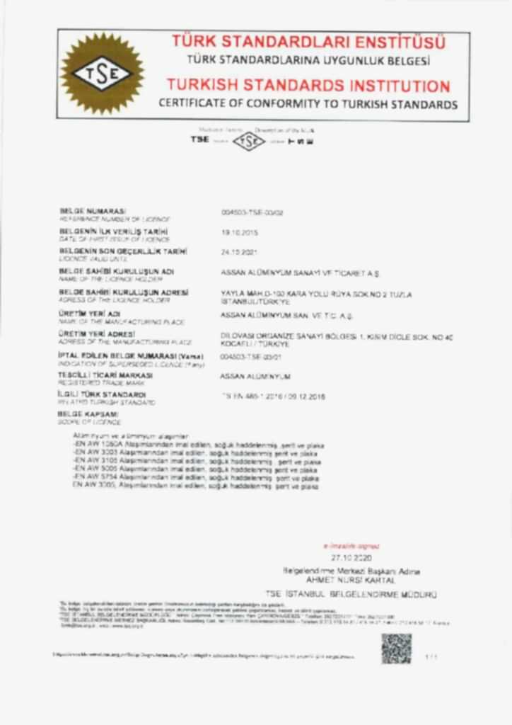 TSE Uygunluk Belgesi(TS EN 485-1 A1) Dilovası