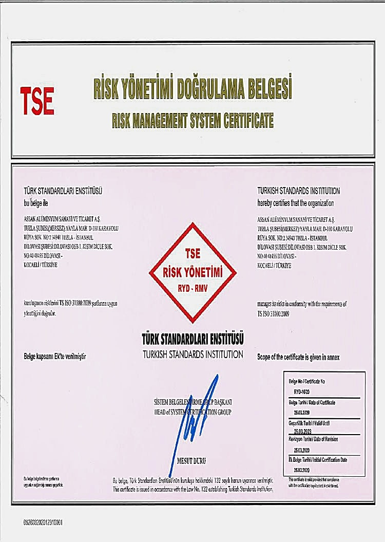 ISO 31000 Risk Yönetimi Sistemi Doğrulama Belgesi